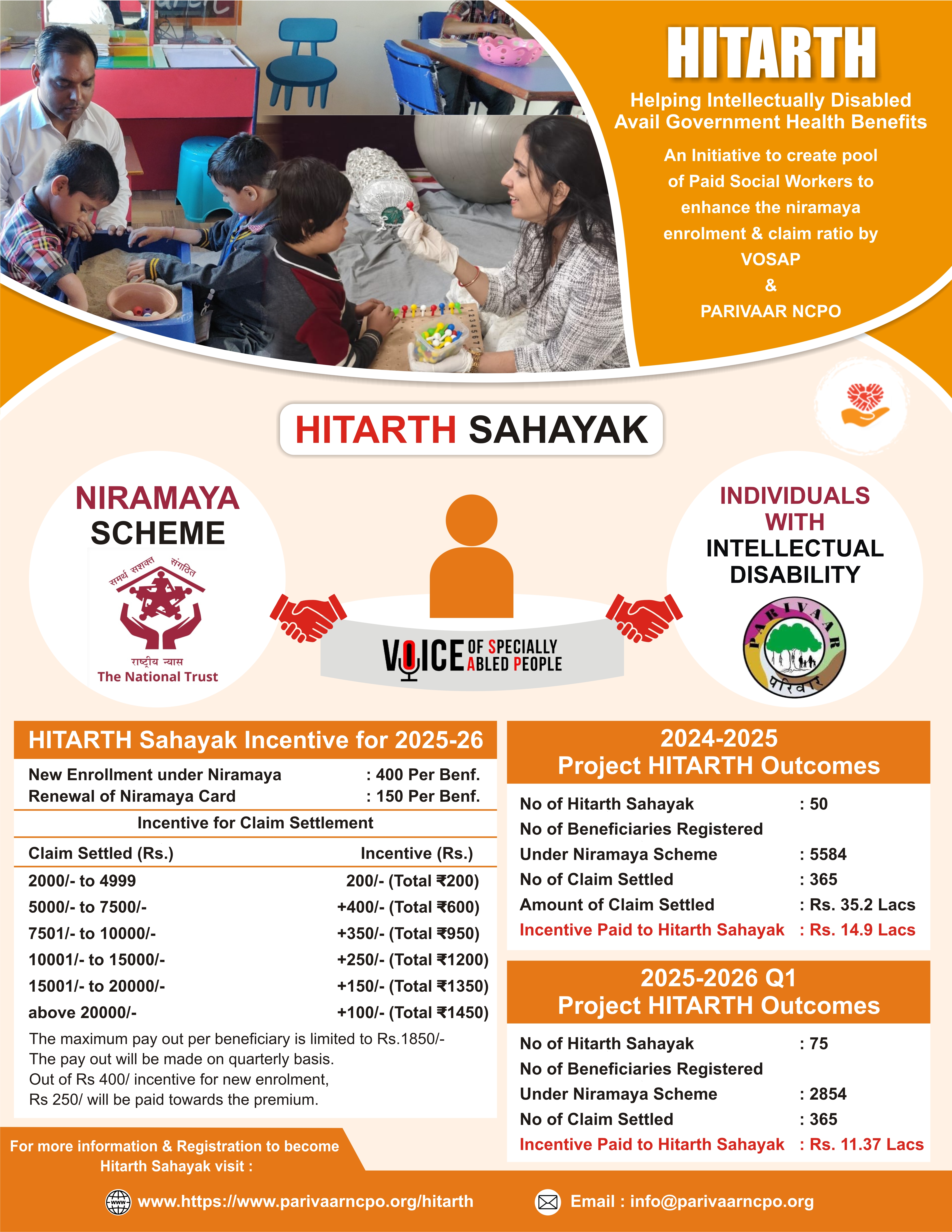 The HITARTH Scheme is a unique initiative launched in 2024 by Voice of Special Abled People (SAP) and PARIVAAR NCPO to enhance enrolment in the Niramaya Health Insurance Scheme. The initiative leverages the extensive networks and resources of PARIVAAR NCPO and other organizations working with persons with intellectual and developmental disabilities (Autism, Cerebral Palsy, and Intellectual Disability). Under this scheme, trained social workers, called “Hitarth Sahayak,” are appointed and incentivized as per the scheme guidelines.